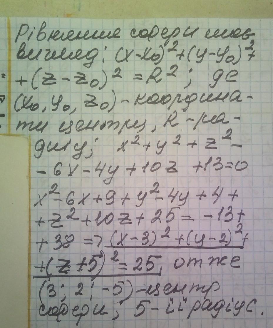Доведіть, що рівняння х2+ у2 + z2 - 6х - 4у + 10 z +13 = 0 є рівнянням сфери, укажіть координати центра та радіус цієї сфери.