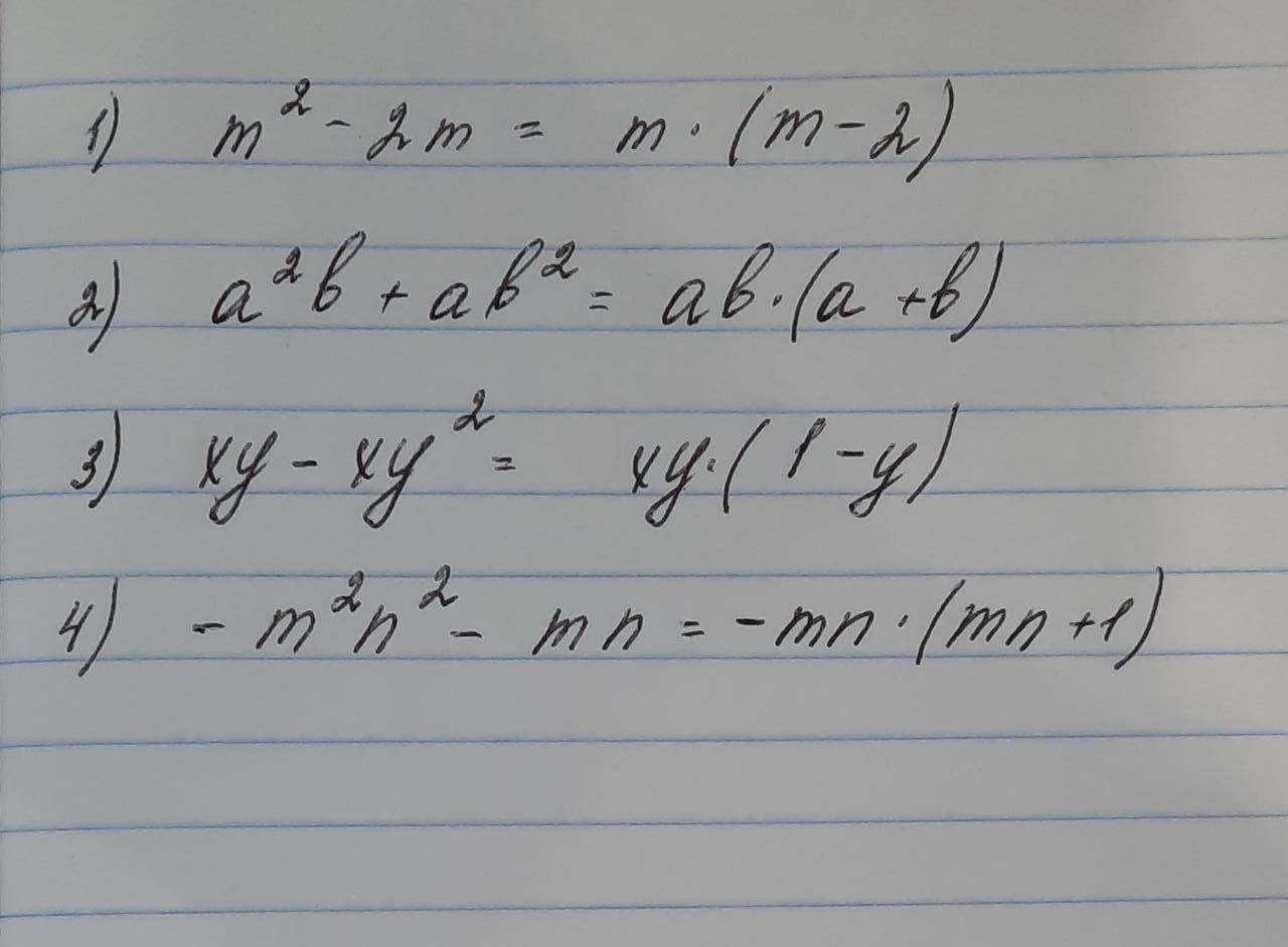 разложите на множители. 1) m²-2m. 2) a²b+ab². 3) xy-xy². 4) -m²n²-mn