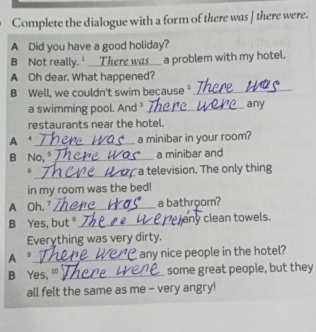 2. there wasn't 3. there weren't. 4. Was there a . ? - в вопросе was/were выносим на первое место. 5. There wasn't 6. There wasn't. 7. Was there a bathroom? - вопрос, поэтому was - на первом месте. 8. Правильно.9. Were there any...? - вопрос, Were - наперед, перед there. 10. Правильно, только there пиши с маленькой буквы в середине предложения.