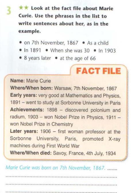 Надо посмотреть на файл с фактами о Мари Кюри и написать о ней полные предложения, как в примере.
