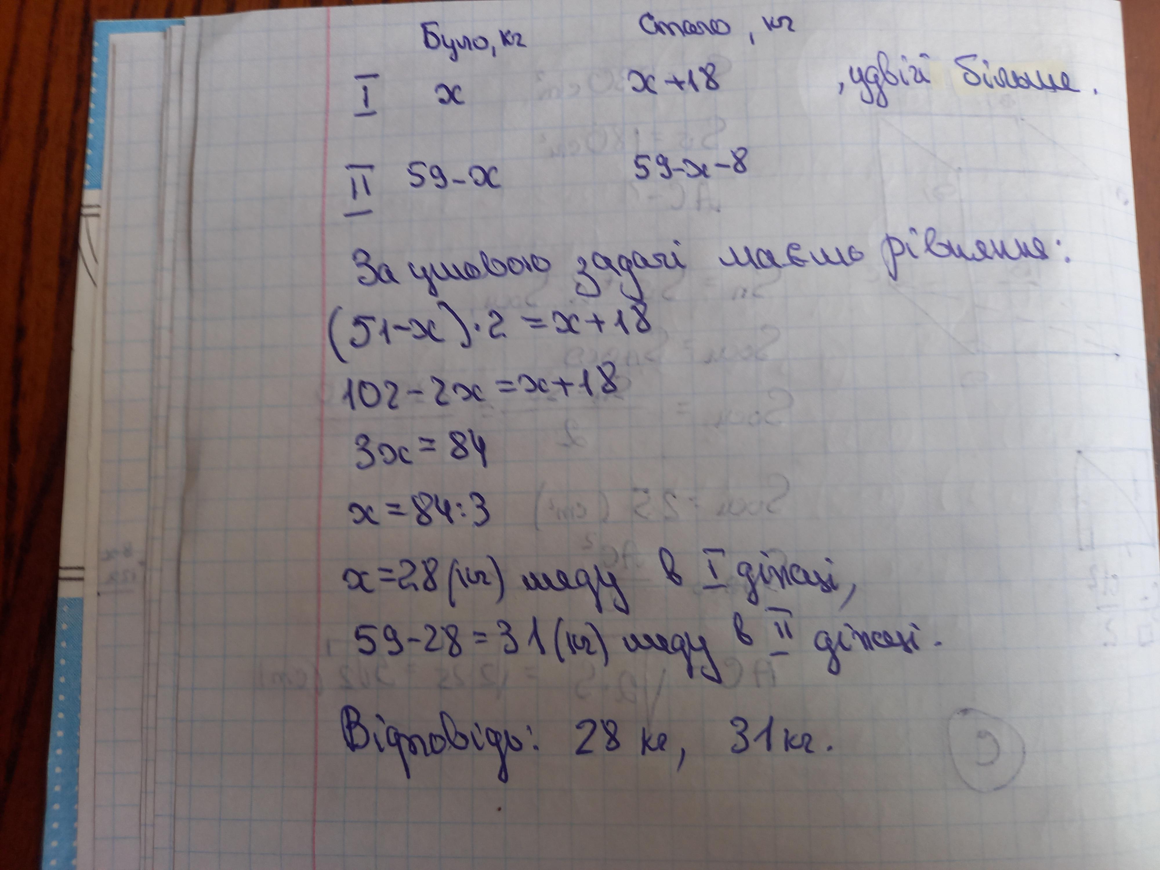 В обох діжках було 59 кілограмів меду після того як до першої діжки добавили 18 кг меду а з другої забрали 8 кг то в першій діжці стало меду удвічі більше ніж у другій скільки кілограмів меду було в кожній діжці спочатку?