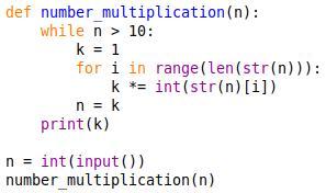 Ваша задача — написать программу, которая перемножает все цифры, введенного пользователем целого числа, пока оно не станет меньше либо равной 9. Число вводит пользователь с клавиатуры, и оно всегда должно быть больше нуля.