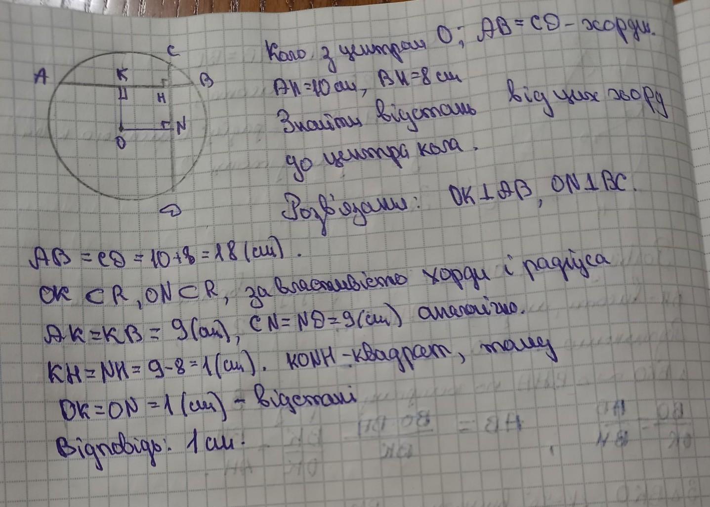 відрізки довжиною 8 см і 10 см. Знайдіть відстані від цих хорд до центра
