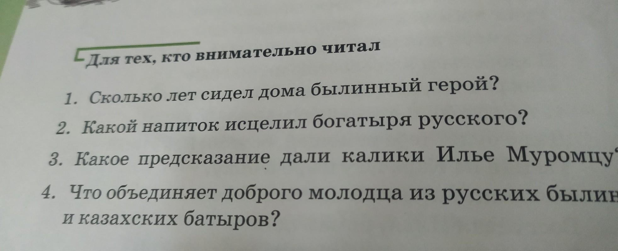 Для тех, кто внимательно читал 1. Сколько лет сидел дома былинный герой? 2. Какой напиток исцелил богатыря русского? 3. Какое предсказание дали калики Илье Муромцу? 4. Что объединяет доброго молодца из русских былин и казахских батыров?