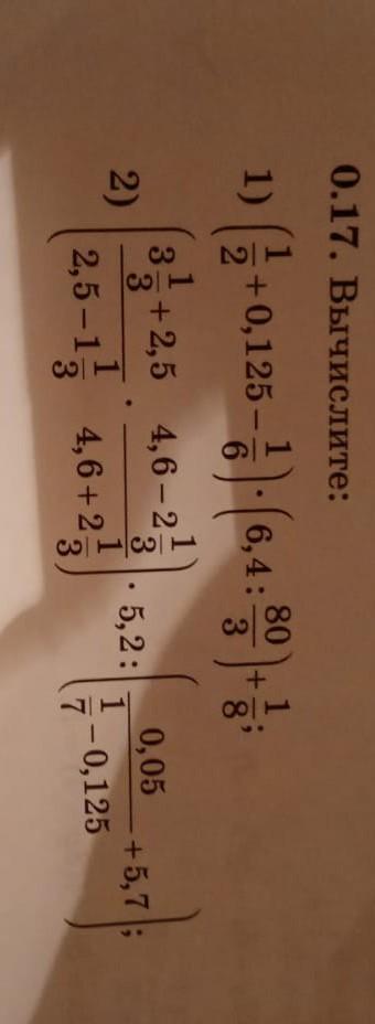 0.17. Вычислите: 1) (2+0,125- 2) 5-7)(6,4: 80 3 3+2,5 4,6-2- 1 2,5-1 4,6+2 3 3 1 3 + 5,2: 1 7 0,05 -0,125 +5,7;