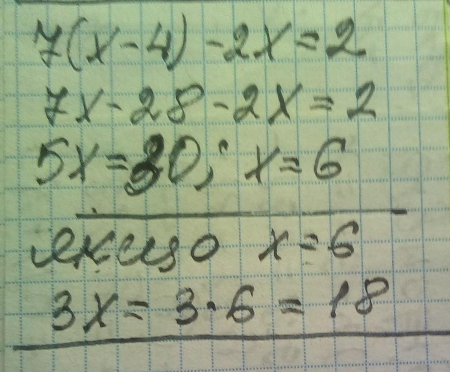 Чому дорівнює 3х, якщо 7(x - 4) - 2x=2