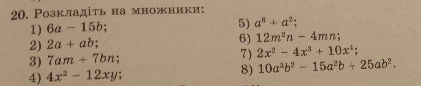 3) 7am + 7bn 4) 4x ^ 2 - 12xy