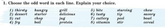 1. grill 2. delicious 3. jug 4.protein 5. starving 6. tip 7. peel 8.stir