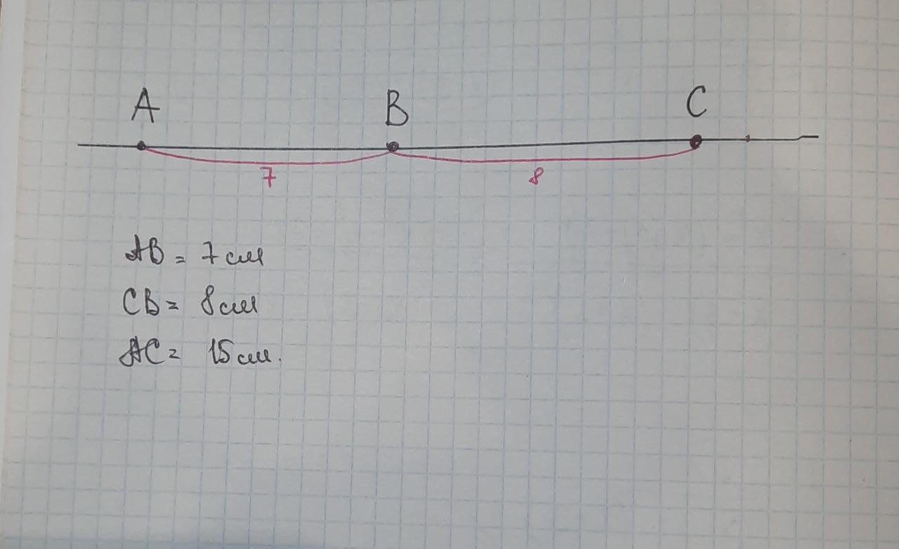 3. Точки А,В,С розміщені на одній прямій, АВ=7см, АС=15см, СВ=8см. Яка з точок знаходиться між двома іншими?