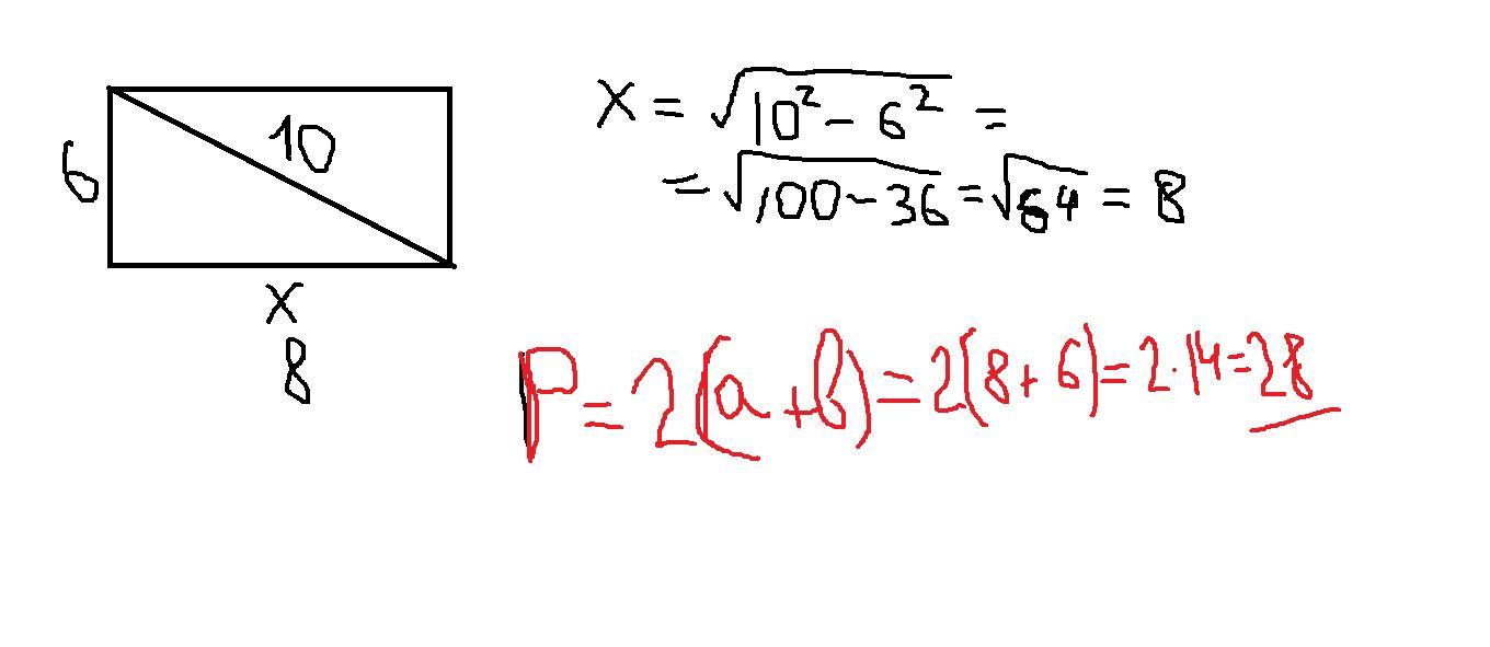 Одна из сторин прямокутника доривнюе 6 м.знайти його периметр якщо його диагональ доривнюе 10 м