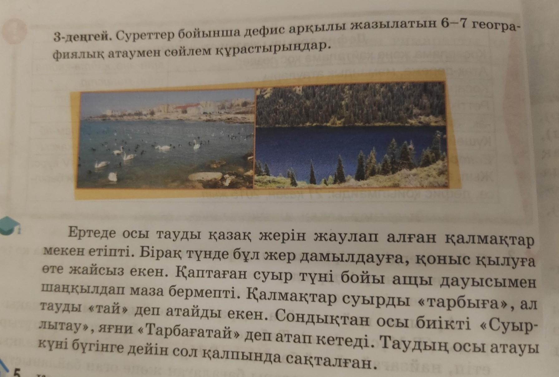 0 3-деңгей. Суреттер бойынша дефис арқылы жазылатын 6-7 геогра- фиялық атаумен сөйлем құрастырыңдар. Ертеде осы тауды қазақ жерін жаулап алған қалмақтар мекен етіпті. Бірақ түнде бұл жер дамылдауға, коныс қылуға өте жайсыз екен. Қаптаған суыр түні бойы ащы дауысымен шаңқылдап маза бермепті. Қалмақтар суырды тарбыга», ал тауды