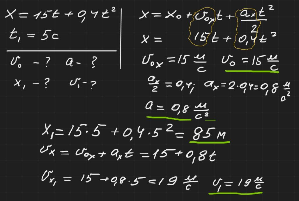 Задача 3 Рух тіла описується рівнянням x=15t+0,4t². Визна- чити початкову швидкість і прискорення тіла, а також координату і швидкість тіла через 5 с.