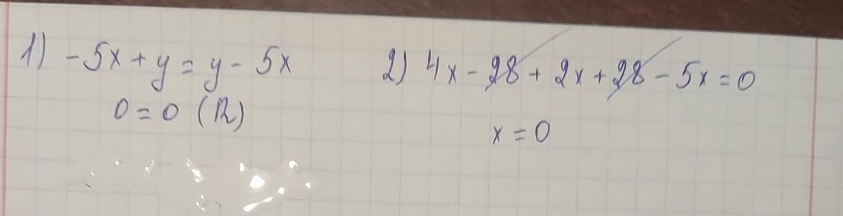 1) -(5 x - y) = y - 5x. 2) 4(x- 7) + 2(x + 14) = 5x.