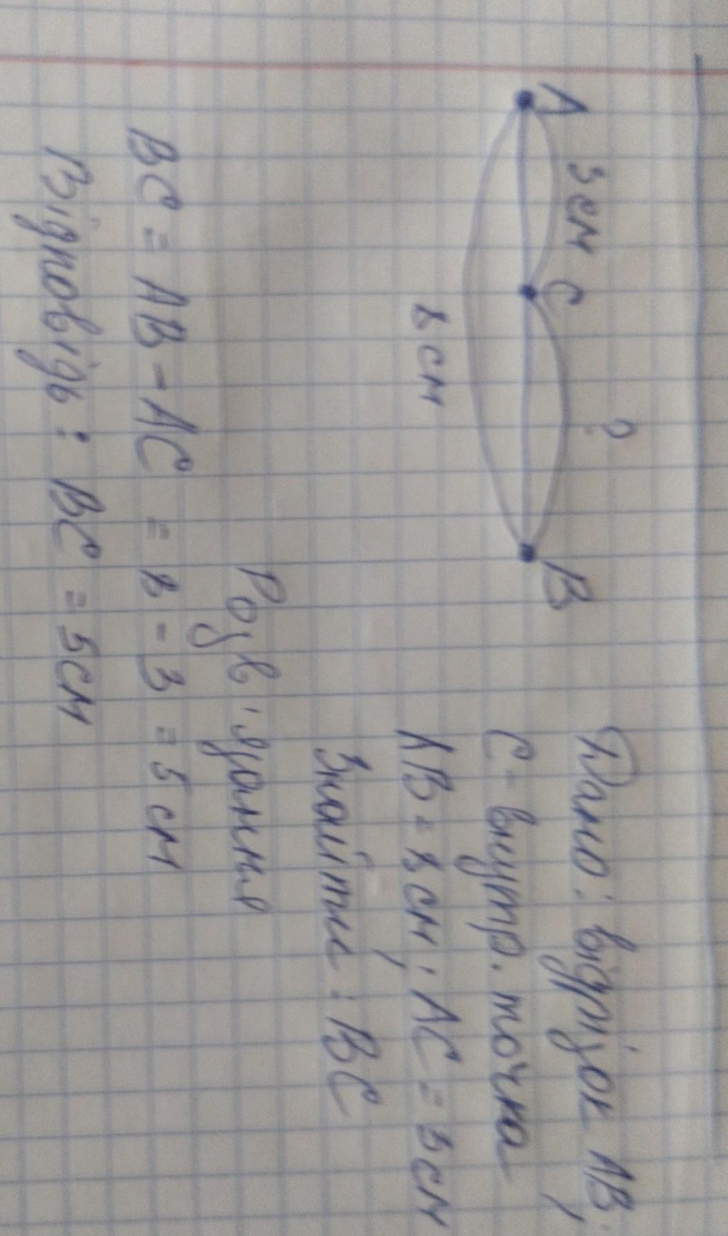 дано відрізок АВ .точка С-внутрішня точка цього відрізка.відомо що АВ=8см АС-3см яка довжина ВС