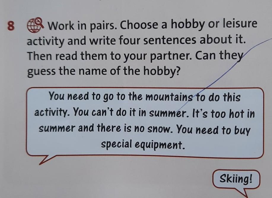 8 Work in pairs. Choose a hobby or leisure activity and write four sentences about it. Then read them to your partner. Can they guess the name of the hobby? You need to go to the mountains to do this activity. You can't do it in summer. It's too hot in summer and there is no snow. You need to buy special equipment.