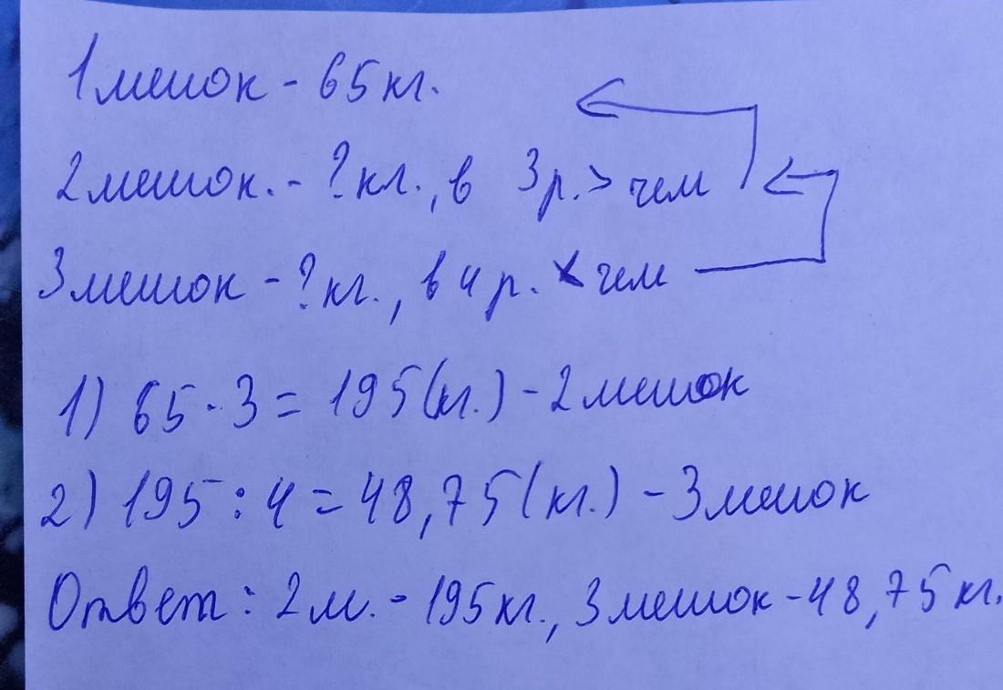 В первом мешке было 65 кг крупы, во втором - в 3 раза больше, чем в первом, а в третьем в 4 раза меньше чем во втором. Сколько кг крупы в каждом мешке?