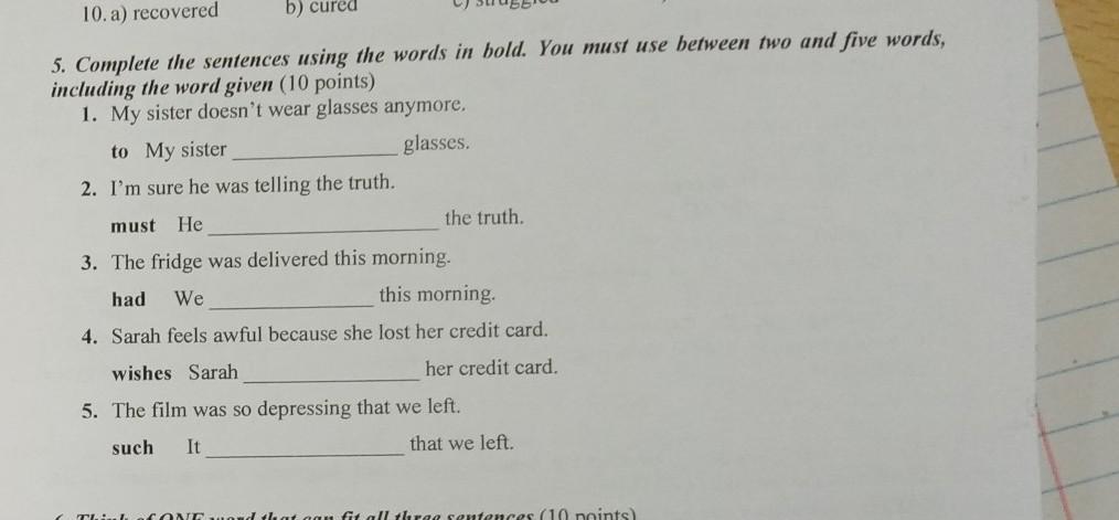 5. Complete the sentences using the words in bold. You must use between two and five words, including the word given (10 points) 1. My sister doesn't wear glasses anymore. glasses. to My sister 2. I'm sure he was telling the truth. must He 3. The fridge was delivered this morning. had We this morning. 4. Sarah feels awful because she lost her credit card. wishes Sarah her credit card. 5. The film was so depressing that we left. such It the truth. that we left.