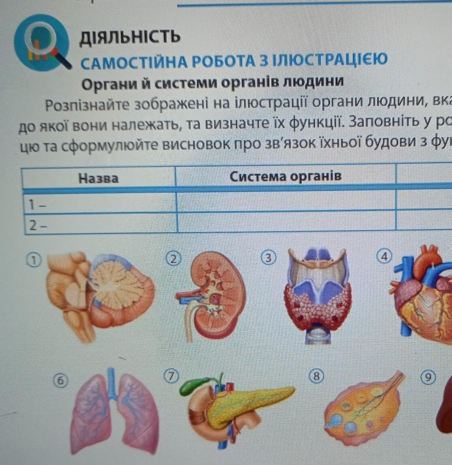 ДІЯЛЬНІСТЬ САМОСТІЙНА РОБОТА З ІЛЮСТРАЦІЄЮ Органи й системи органiв людини Розпізнайте зображені на ілюстрації органи людини, вкажiть систему органів, до якої вони належать, та визначте їх функції. Заповніть у робочому зошиті табли- цю та сформулюйте висновок про зв'язок ïхньої будови з функціями. Назва Система органів 1- 2- 3 8 Функції (5)