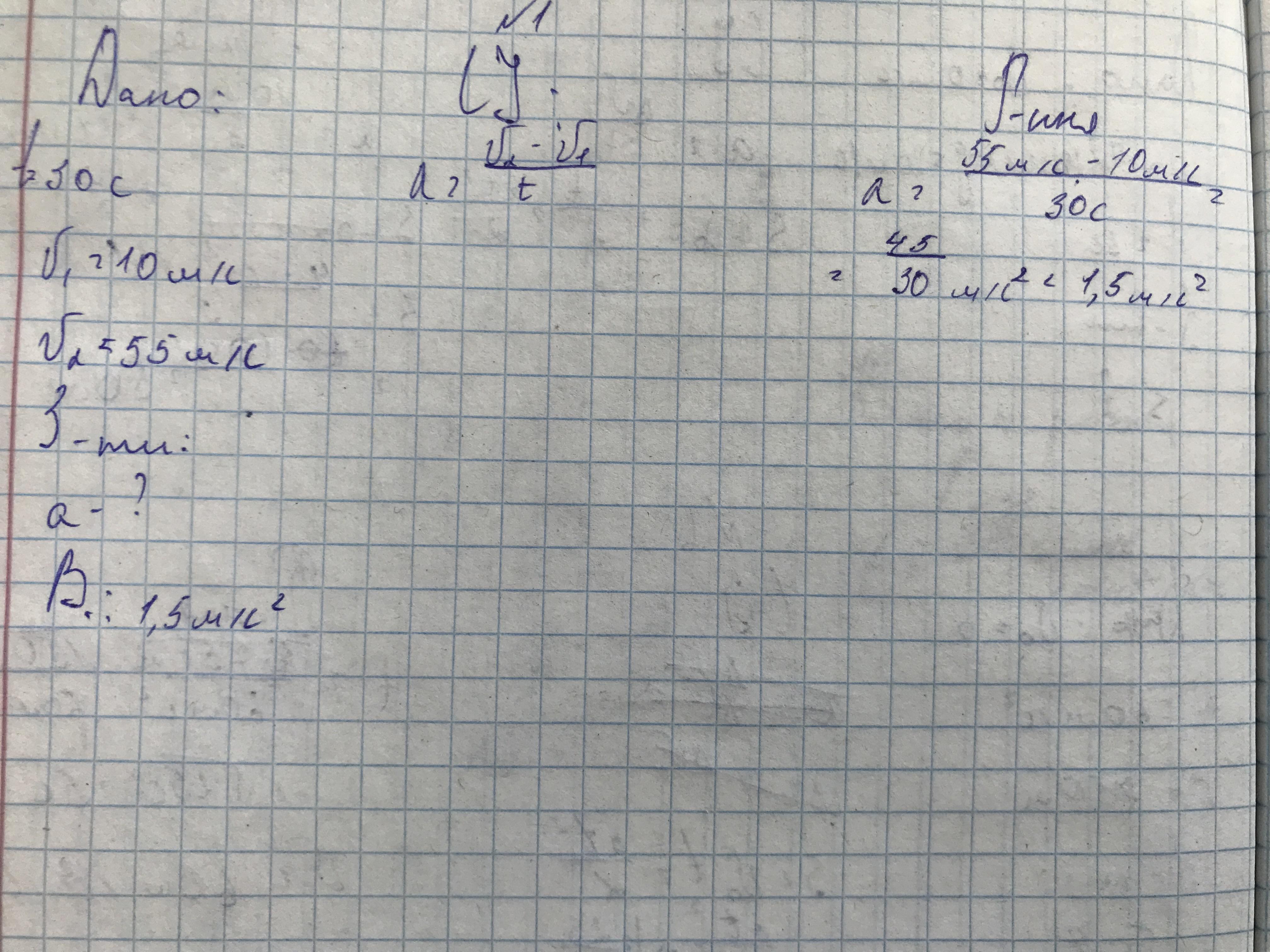 певного проміжку часу рухався рівноприскорено. Яким було при цьому прискорення літака, якщо за 30 с його швидкість зросла від 10 м/с до 55 м/с?
