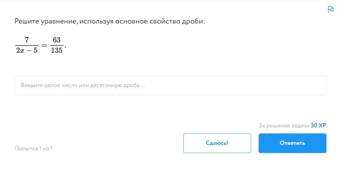 Решите уравнение, используя основное свойство дроби: 7 / 2x - 5 = 63/135