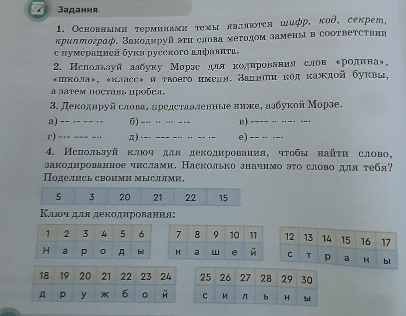 1 Н 18 Д Задания 1. Основными терминами темы являются шифр. код, секрет, криптограф. Закодируй эти словом замены в соответствии с нумерацией букв русского алфавита. 2. Используй азбуку Морзе для кодирования слов родина «класс» и твоего имени. Запиши код каждой буквы «школа», а затем поставь пробел. 3. Декодируй слова, представленные ниже, азбукой Морзе. a) -- B) - e) -- г) -.- 4. Используй ключ для декодирования, чтобы найти слово, закодированное числами. Насколько значимо это слово для тебя? Поделись своими мыслями. 21 5 20 Ключ для декодирования: 3 6 a р 19 20 p 3 5 О Д 6) - Д) .-. 4 mee y Ж 6 Ы 21 22 23 24 O й Н 22 15 8 9 10 11 Ш е й а 12 13 14 Р Ь с T 25 26 27 28 29 с и Л Н 30 Ы 15 16 17 a Н Ы