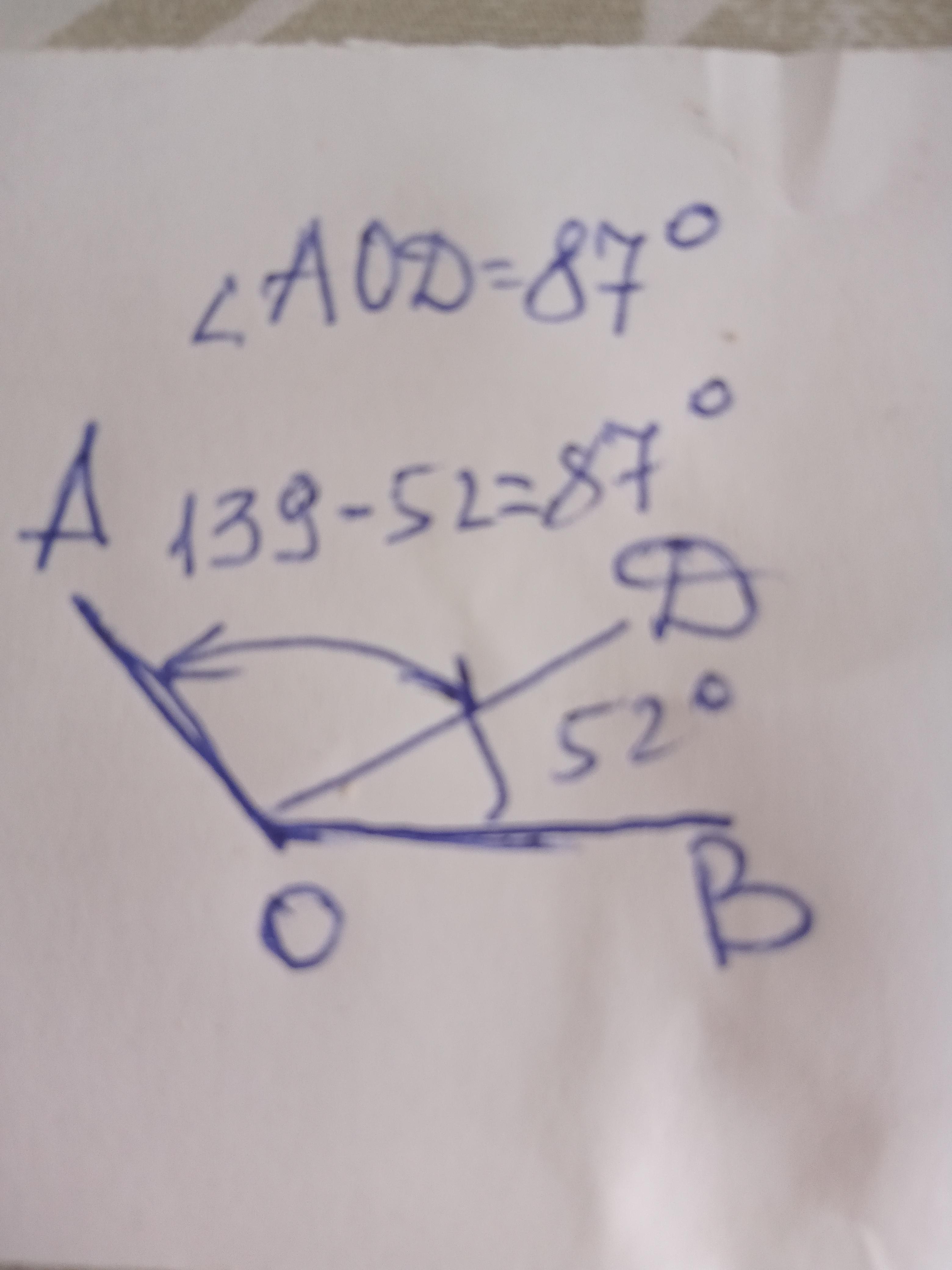 Кут AOB=139°. Від променя OB відкладено кут BOD, що дорівнює 52°, так, що промінь OD проходить між сторонами кута AOB. Побудуйте рисунок. Знайдіть величину ∠AOD