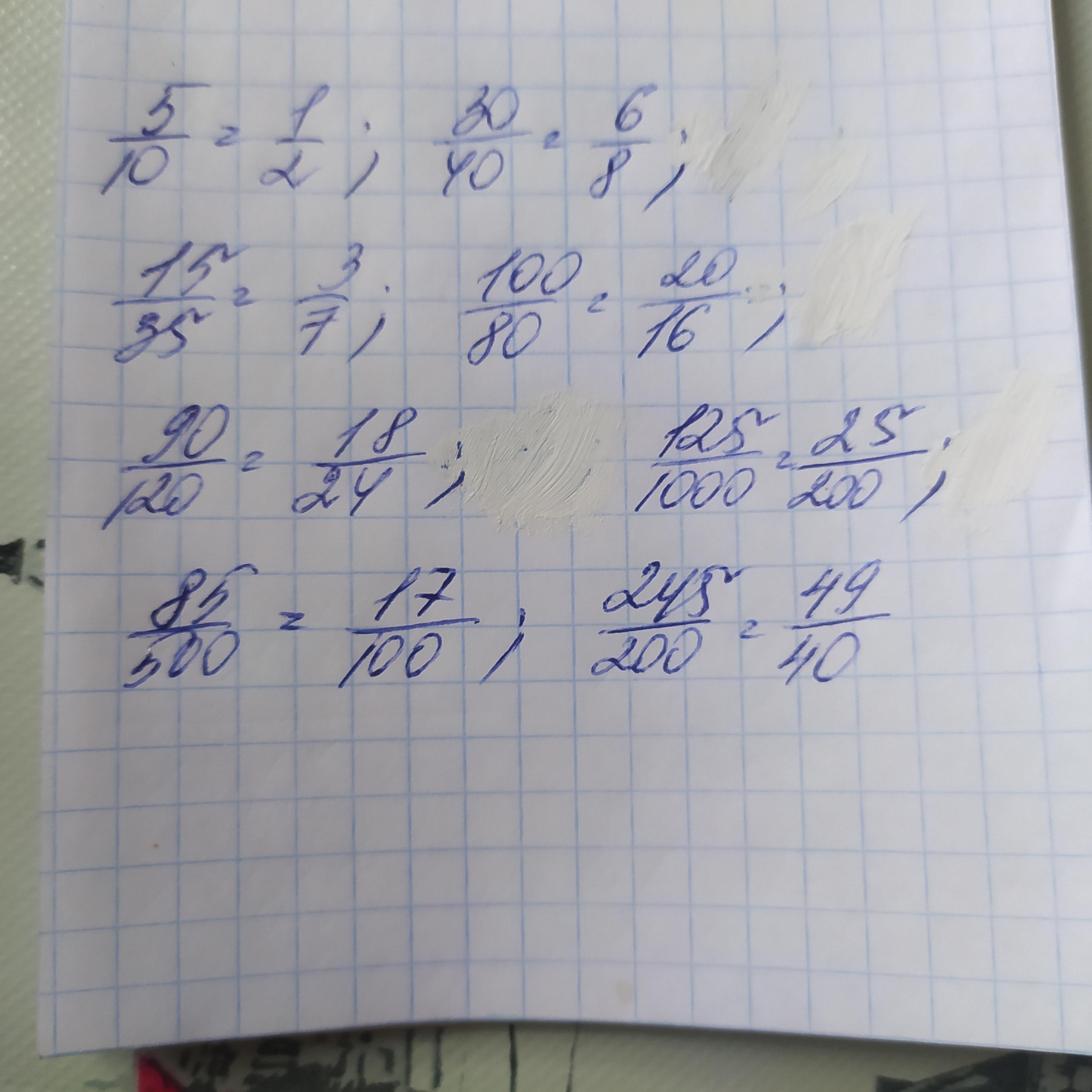 149. Раздели числитель и знаменатель каждой дроби на 5: 5/10 , 30/40 , 15/35, 100/80 , 90/120 , 125/1000, 85/500, 245/200