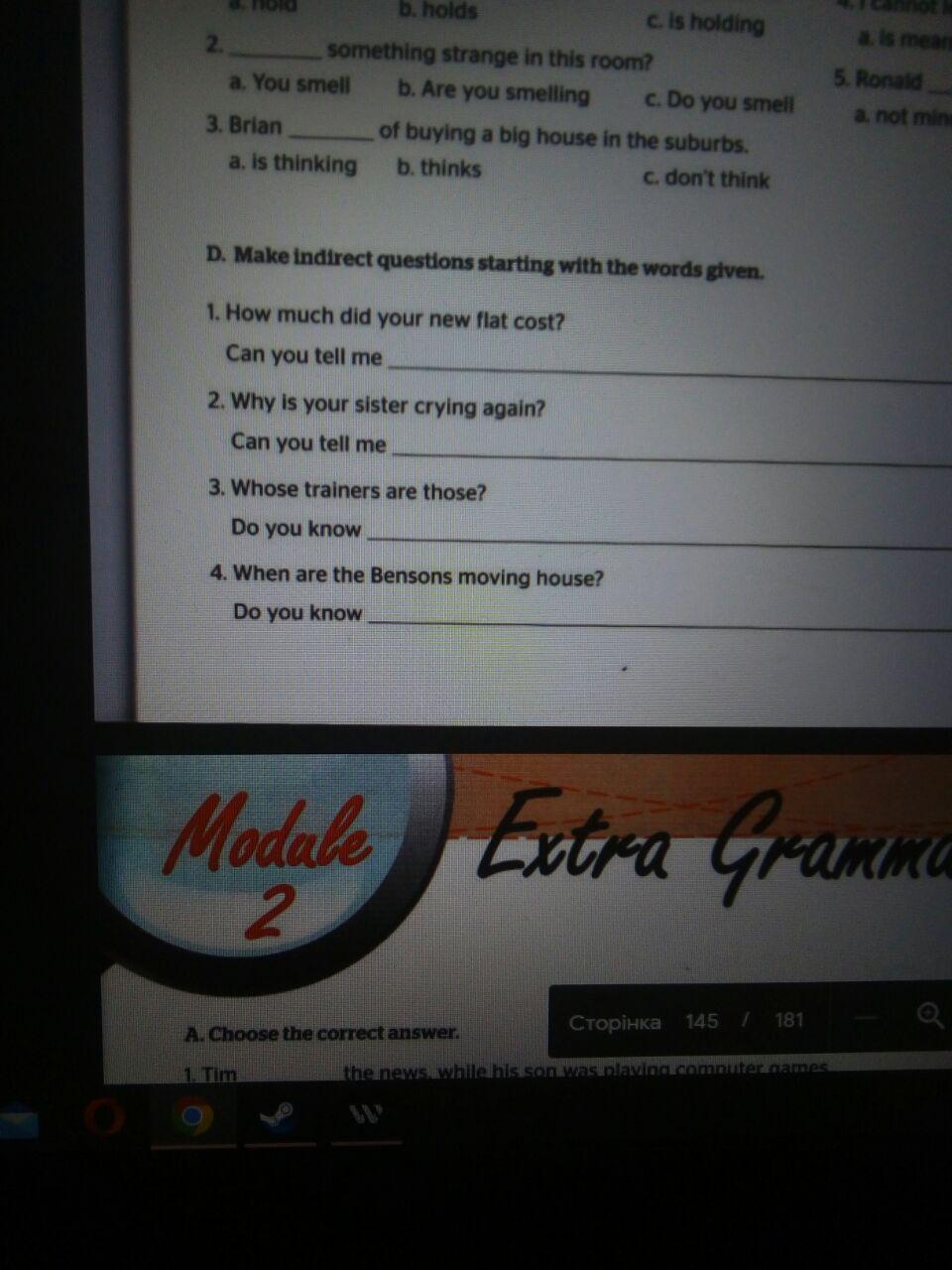 D. Make indirect questions starting with the words given. 1. How much did your new flat cost? Can you tell me 2. Why is your sister crying again? Can you tell me 3. Whose trainers are those? Do you know 4. When are the Bensons moving house? Do you know