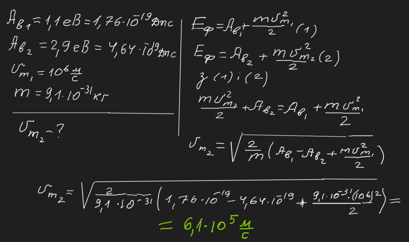 Срочно!!! Монохроматичне світло падає на поверхні двох різних металів. Для першого з них робота виходу електронів дорівнює 1,1еВ, а для другого — 2,9еВ. Визначте максимальну швидкість фотоелектронів, що вилітають із другого металу, якщо для першого металу ця швидкість дорівнює 10^6м/с. (маса електрона m=9,1*10^-31кг, а 1еВ=1,6*10^-19Дж)