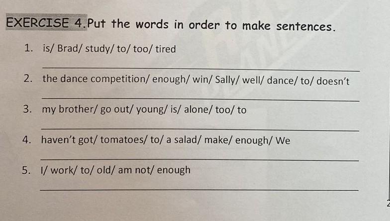 EXERCISE 4. Put the words in order to make sentences. 1. is/ Brad/ study/ to/ too/ tired 2. the dance competition/ enough/ win/ Sally/ well/dance/to/ doesn't 3. my brother/ go out/ young/is/ alone/ too/to 4. haven't got/ tomatoes/ to/ a salad/ make/ enough/We 5. 1/work/to/ old/ am not/ enough