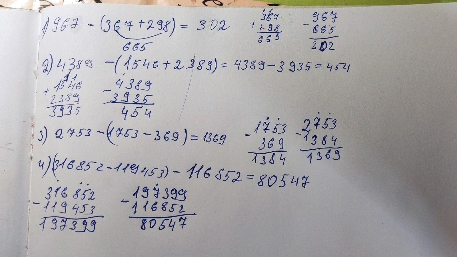 73 Обчисліть найзручнішим способом 1) 967-(367+298); 2) 4389-(1546+2389); способом: 3) 2753-(1753-369); ( 4) (316852-119 453)-116852.