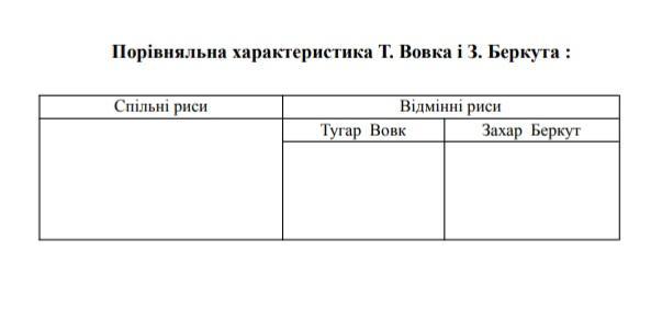 Відмінні:Захар Беркут:патріот за свій дім віддасть свою душу його всі поважають .Тугар Вовк:злий підступний зрадив свою батьківщину