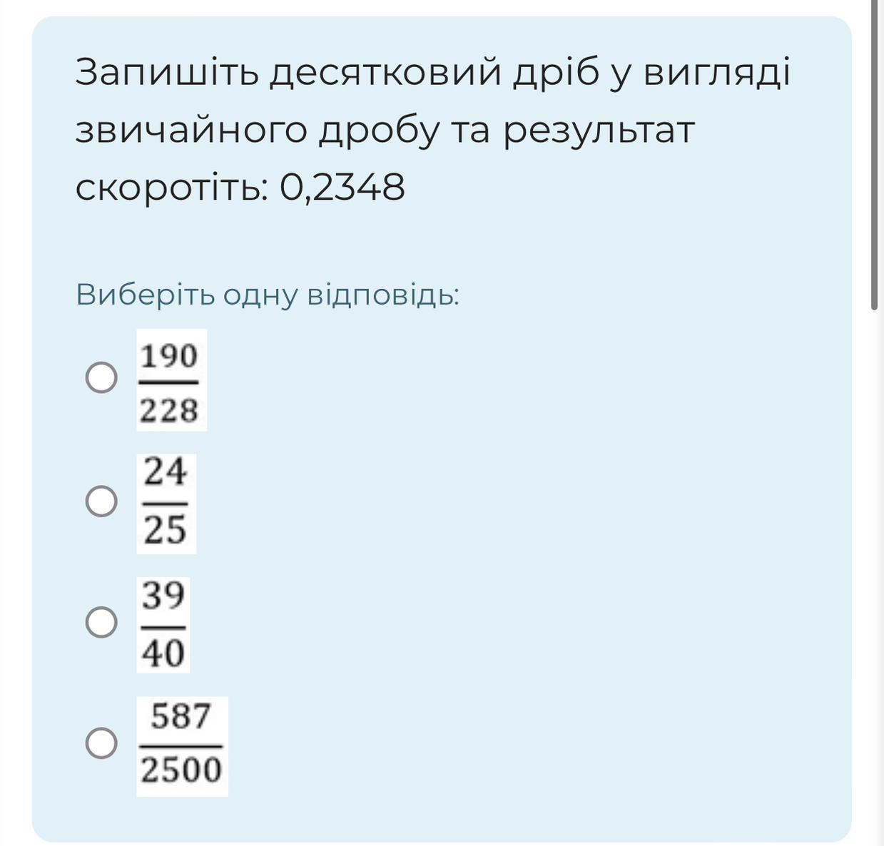 Запишіть десятковий дріб у вигляді звичайного дробу та результат скоротіть: 0,2348