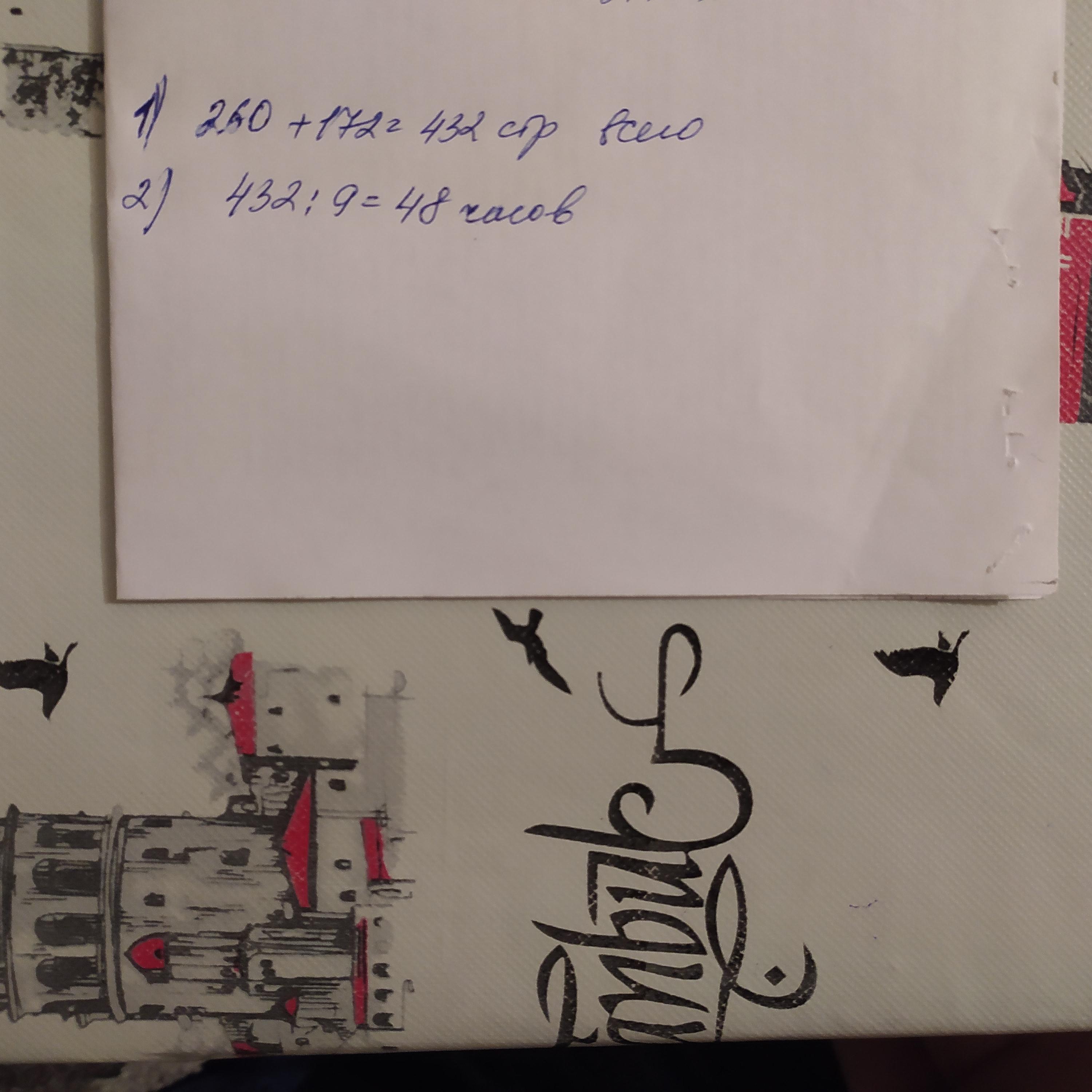 У карлсона две книги. В одной из них 260 страниц,а в другой 172. Карлсон хвастается что за час он может прочитать 9 страниц. Сколько часов ему понадобиться на прочтение всех книг?