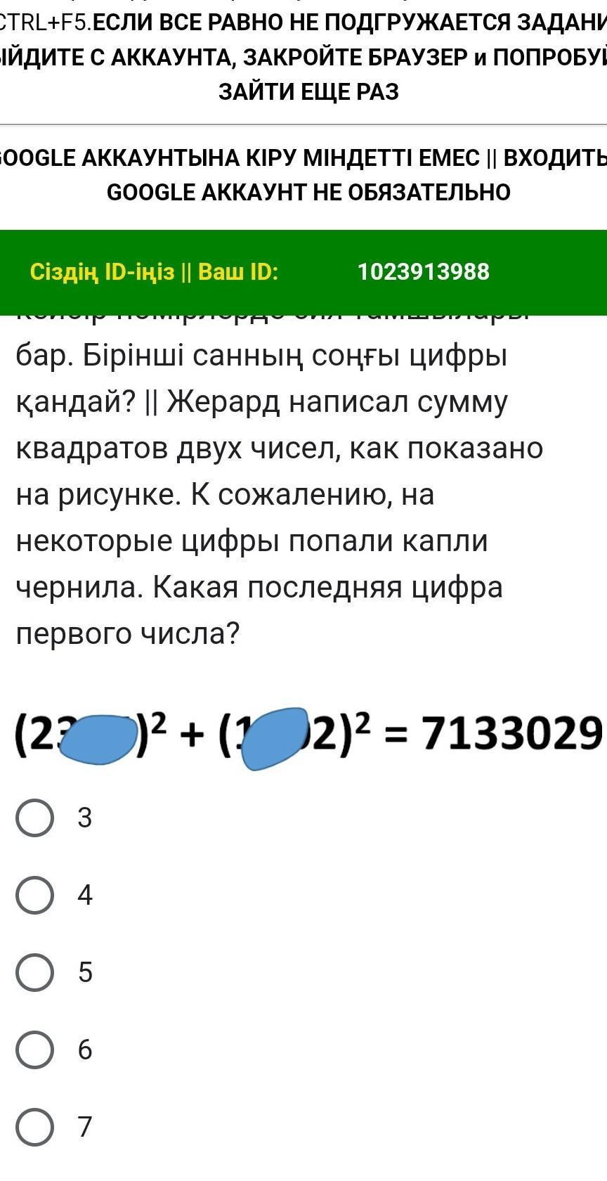 Жерард написал сумму квадратов двух чисел, как показано на рисунке. К сожалению, на некоторые цифры попали капли чернила. Какая последняя цифра первого числа? (22 )² + (¹2)² = 7133029 О з 4 О 5 6 от