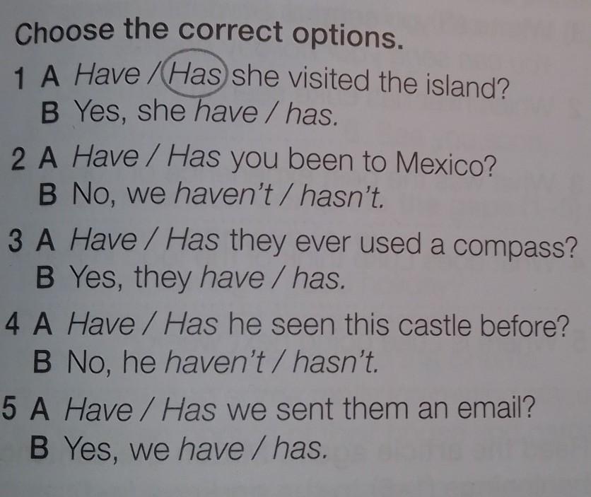 Ответ:1.Has/has 2. Have/haven't 3. Have/have 4. Has/hasn't 5. Have/have