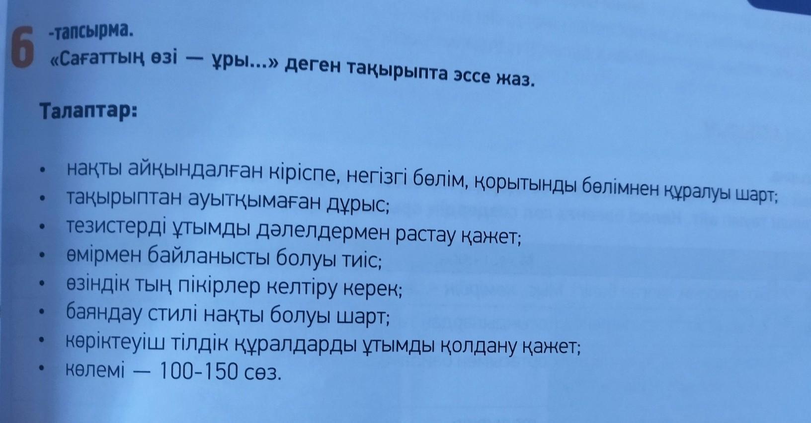 6 ● . Талаптар: нақты айқындалған кiрiспе, негiзгi бөлiм, қорытынды бөлімнен кұралуы шарт; тақырыптан ауытқымаған дұрыс; тезистерді ұтымды дәлелдермен растау қажет; өмірмен байланысты болуы тиіс; ● ● -тапсырма. «Сағаттың өзі ● - ұры...» деген тақырыпта эссе жаз. - өзіндік тың пікірлер келтіру керек; баяндау стилі нақты болуы шарт; көріктеуіш тілдік құралдарды ұтымды колдану қажет; көлемі 100-150 сөз.