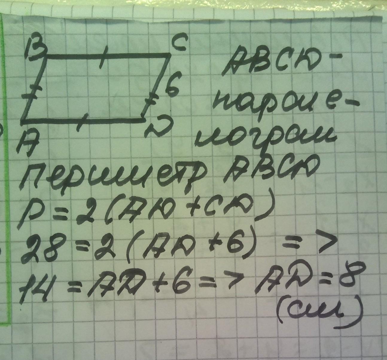 Периметр паралелограму ABCD дорівнює 28см. Знайдіть сторону AD якщо CD=6 см