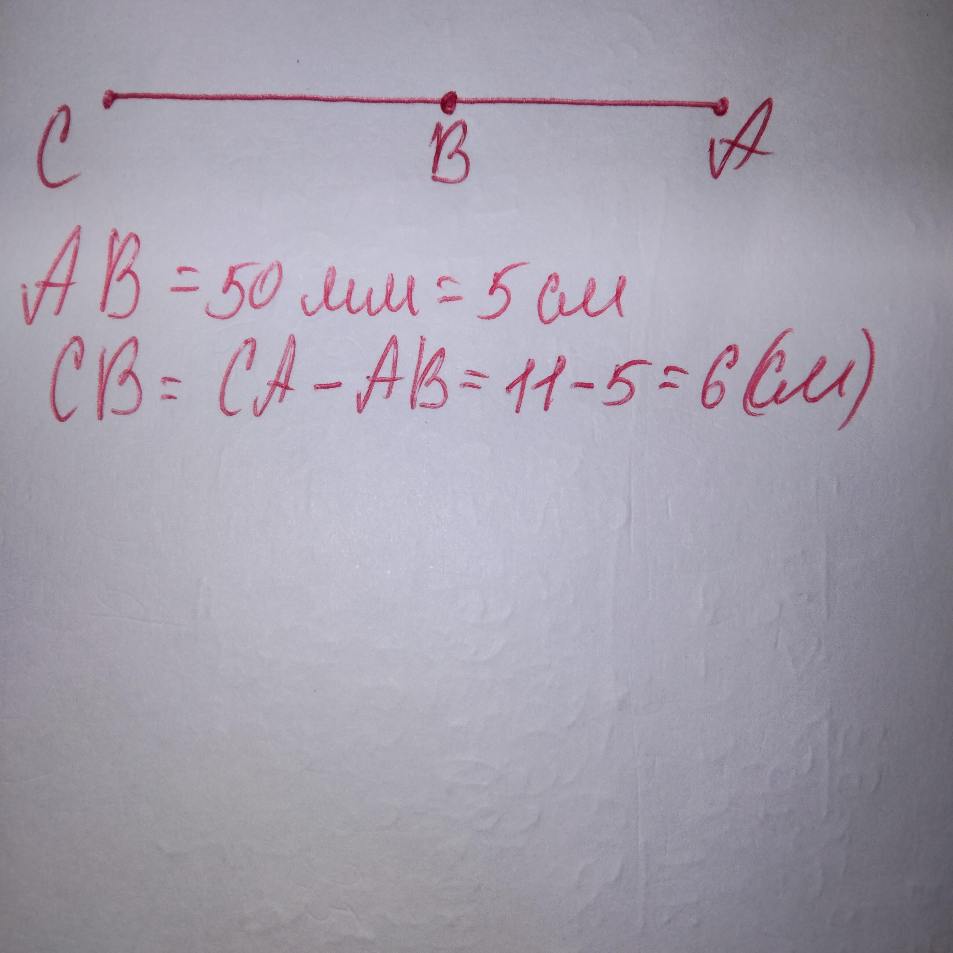 Точка В належить відрізку СА=11 см. АВ=50 мм. СВ=...