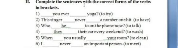 olis. II. Complete the sentences with the correct forms of the verbs in brackets. 1)___ _you ever 2) This singer_ 3) Who_ 4) he 5) When 6) I they yoga? (to try) _never_ a number one hit. (to have) to on the phone now? (to talk) their car every weekend? (to wash) your room? (to clean) an important person. (to meet) you usually _never_