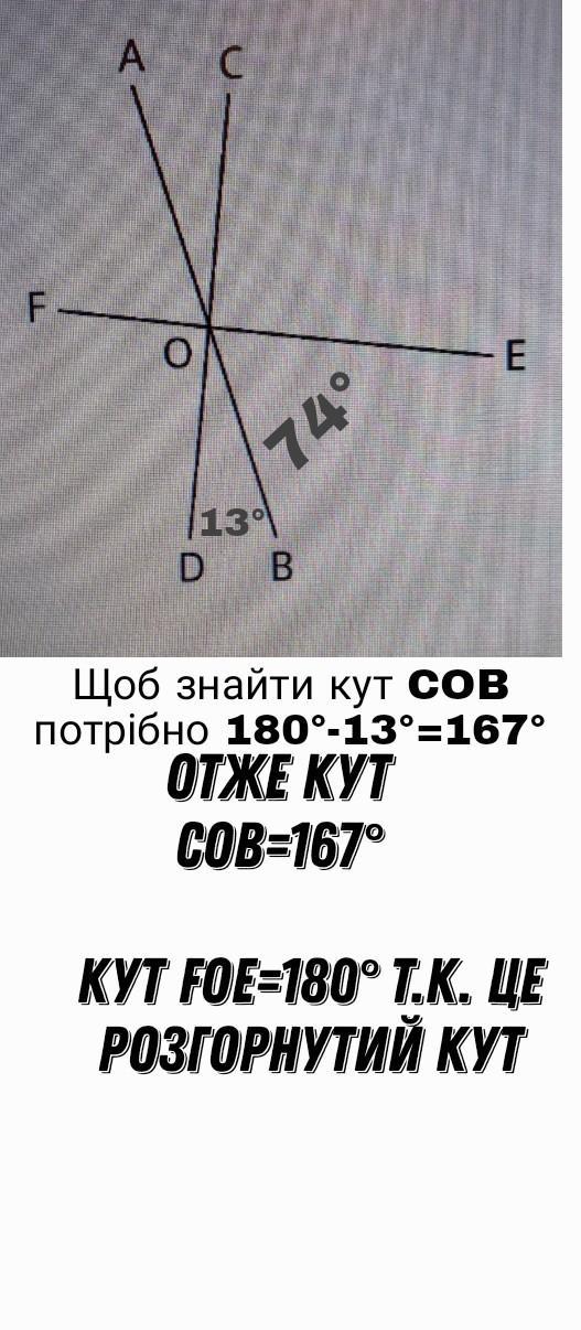 Задание 3. Прямые AB, CD и EF пересекаются в точке O, как показано на рисунке. AOC = 13°, EOB = 74°. Найдите градусные меры углов EOD, COB, FOE.