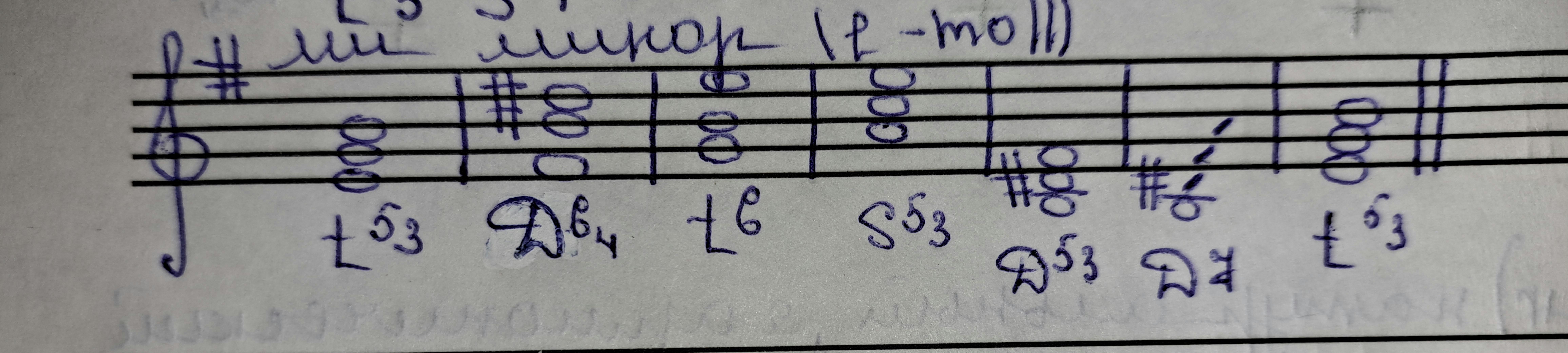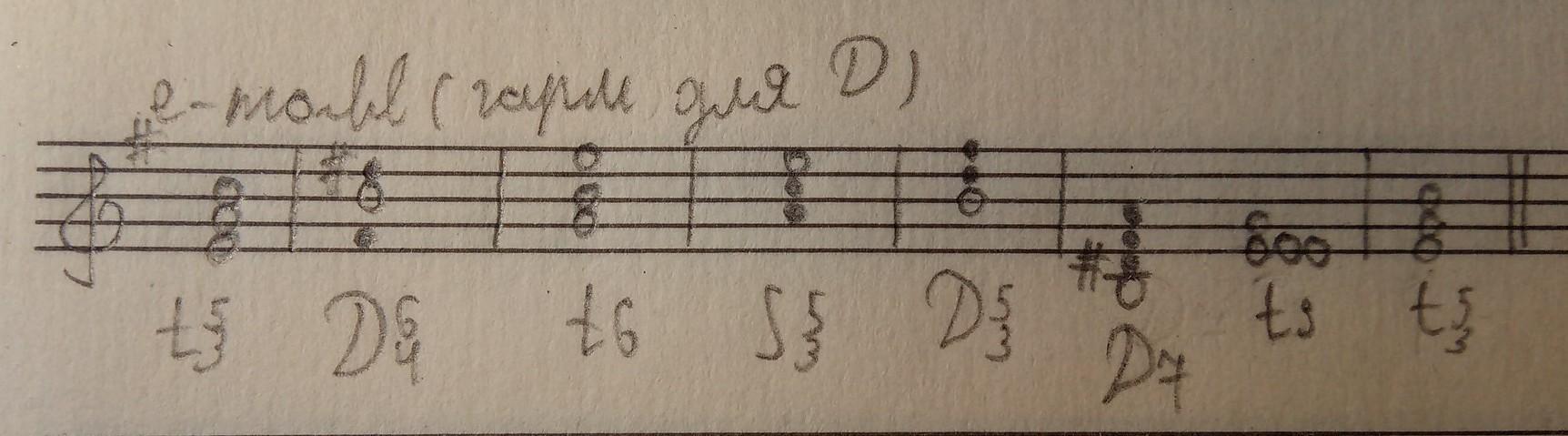 побудувати акордову послідовність у тональності мі мінор: t53-d64-t6-s53-d53-d7-t53