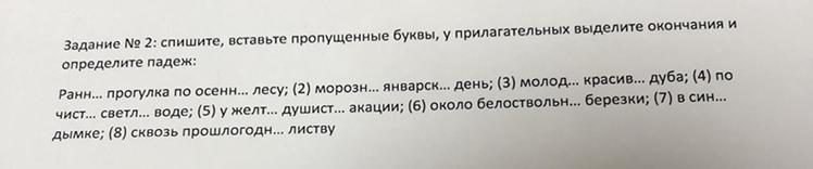 Задание № 2: спишите, вставьте пропущенные буквы, у прилагательных выделите окончания и