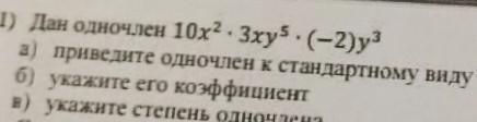а) 10х² • 3ху5 • (-2)y3 = -10х² • 3ху5 • 2у3 = -60 х3 у8