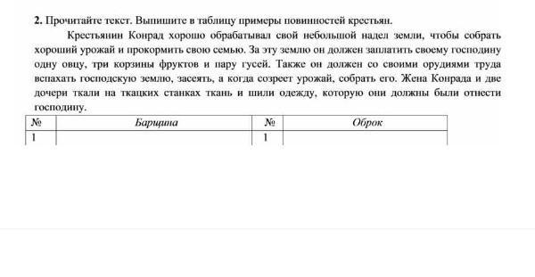 Это Сор помогитет2. Прочитайте текст. Выпишите таблицу примеры повинностей крестьян. Крестьянин Конрад хорошо обрабатывал свой небольшой надел земли, чтобы собрать хороший урожай и прокормить свою семью. За эту землю он должен заплатить своему господину одну овцу, три корзины фруктов и пару гусей. Также он должен со своими орудиями труда вспахать господскую землю, засеять, а когда созреет урожай, собрать его. Жена Конрада и две дочери ткали на ткацких станках ткань и шили одежду, которую они должны были отнести господину.