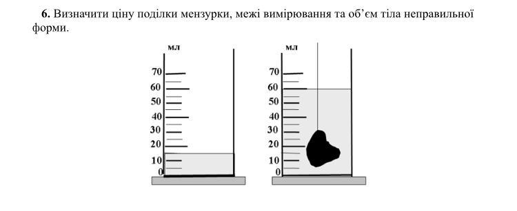 +Ціна поділки мензурки 5 мл. Обєм тіла знаходимо як різницю між обємами води в мензурці з тілом і мензурці до занурення.