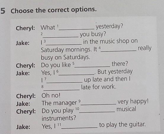 5 Choose the correct options. Cheryl: What' Jake: Cheryl: Jake: 2 | 3 Jake: Cheryl: Oh no! Jake: Cheryl: Saturday mornings. It 4. busy on Saturdays. Do you like 5 Yes, 16 17 8 The manager Do you play instruments? Yes, I 11 yesterday? 9 you busy? in the music shop on there? But yesterday up late and then I late for work. really very happy! musical to play the guitar.