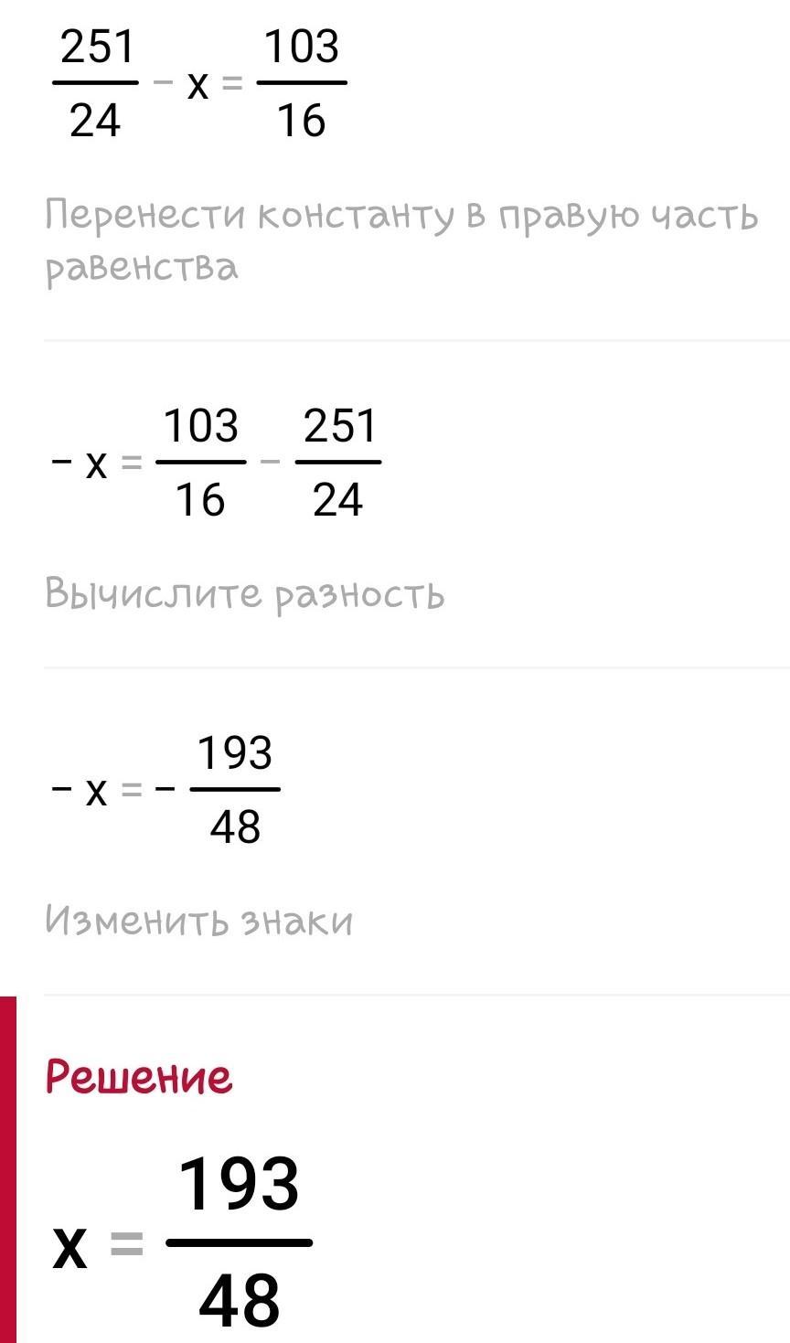 Розв'яжіть рівняння 10 11/24 - x=6 7/16