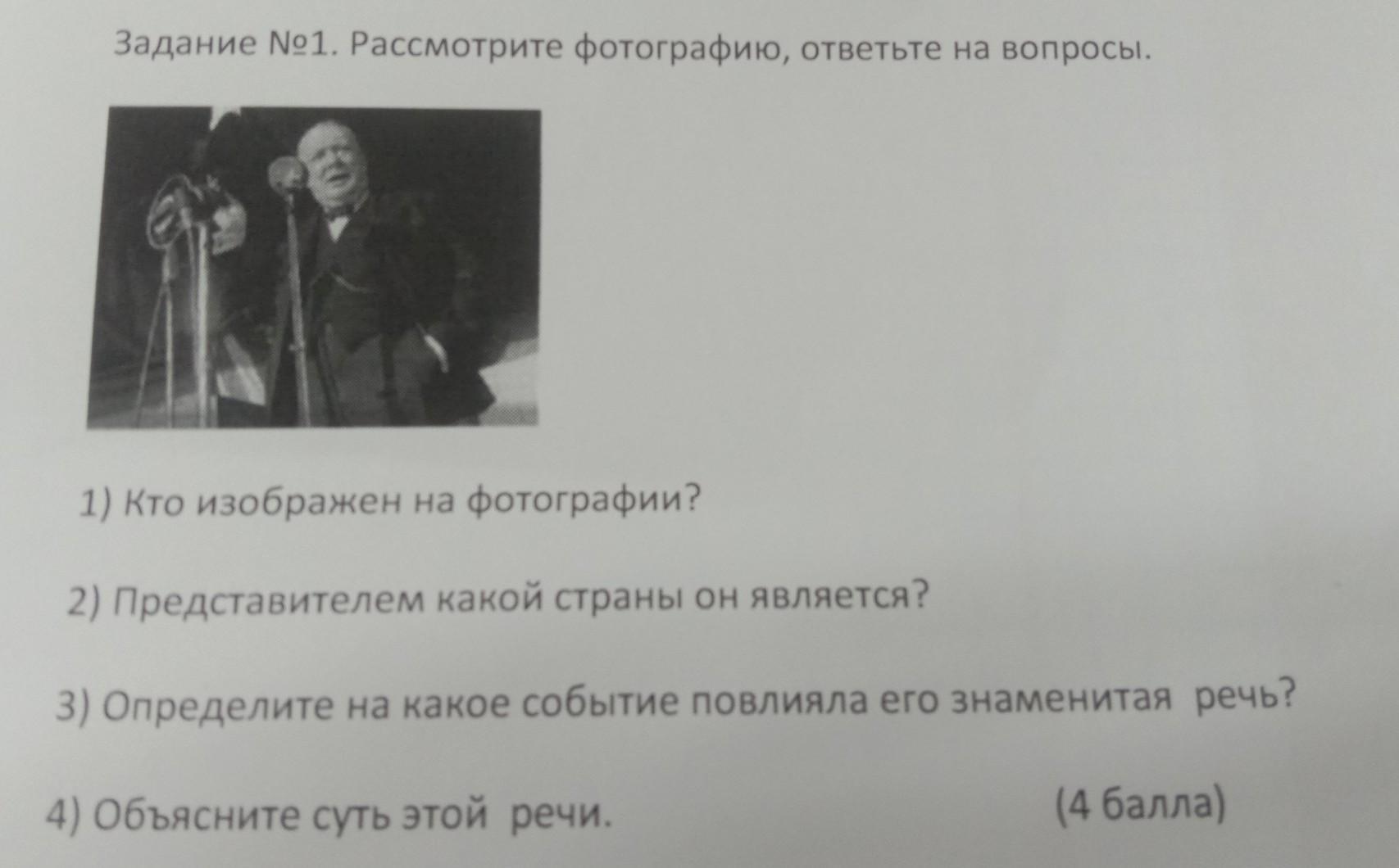 ПОМОГИТЕ ПОЖАЛУЙСТА!!!♥️ Задание N1. Рассмотрите фотографию, ответьте на вопросы. 1) Кто изображен на фотографии? 2) Представителем какой страны он является? 3) Определите на какое событие повлияла его знаменитая речь? 4) Объясните суть этой речи. (4 балла)
