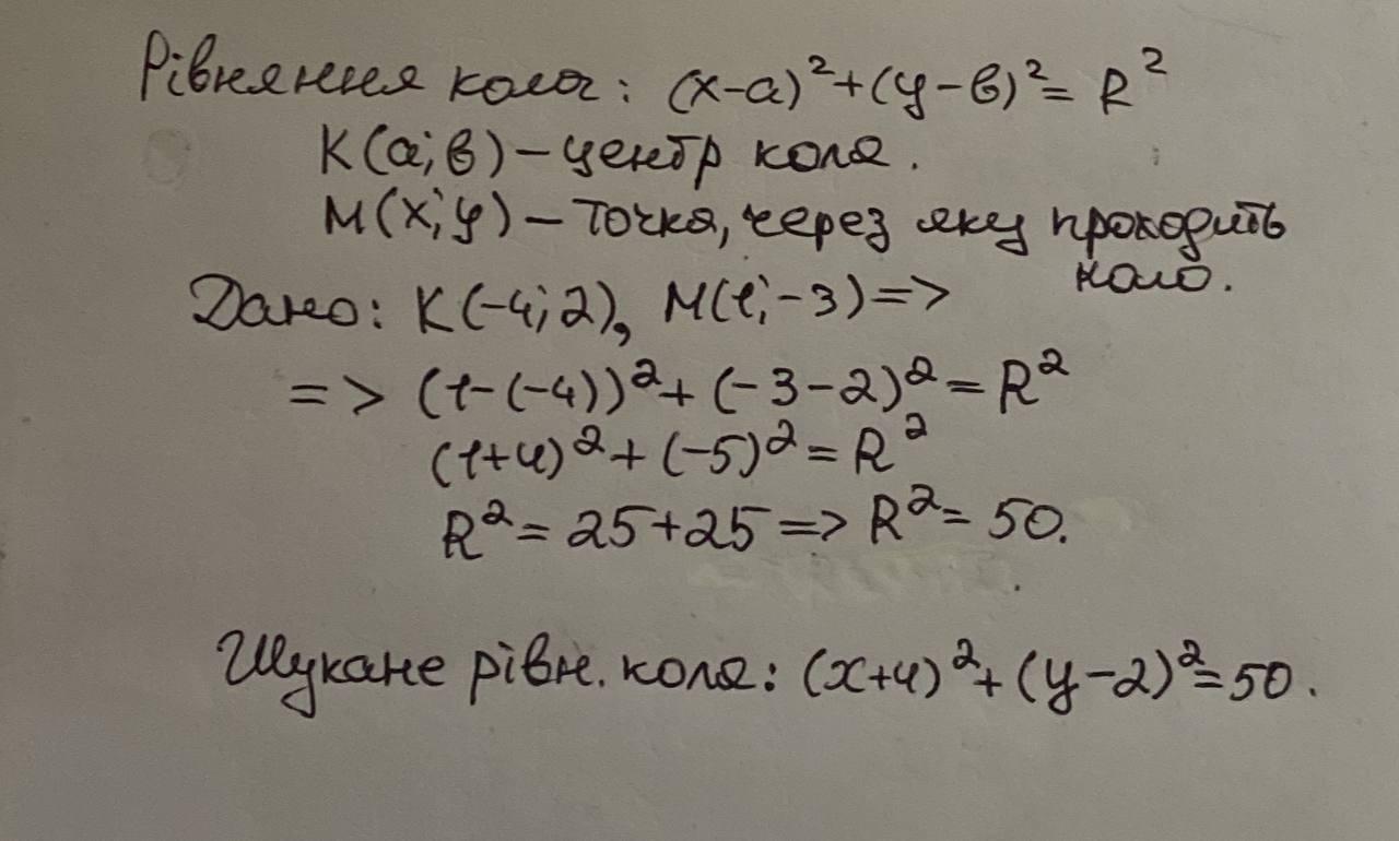 складіть рівняння кола з центром в точці К (- 4;2) та проходить через точку М(1;-3)